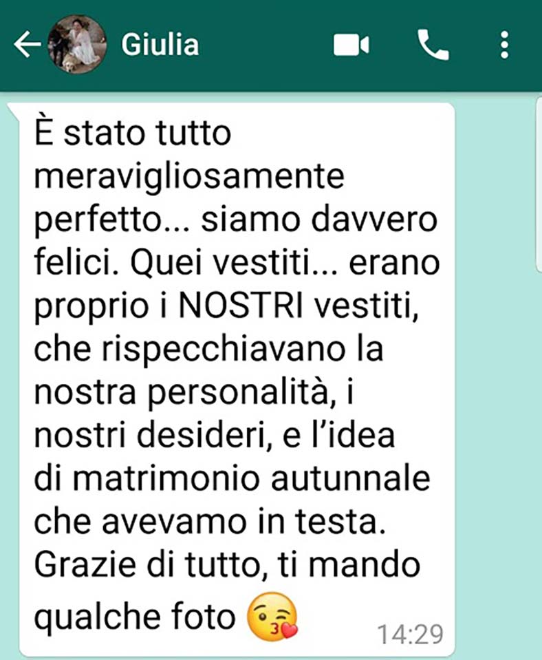 È sempre una grande soddisfazione per me realizzare i desideri dei miei sposi, e quando mi scrivono per ringraziarmi, mi commuovo sempre un pochino…